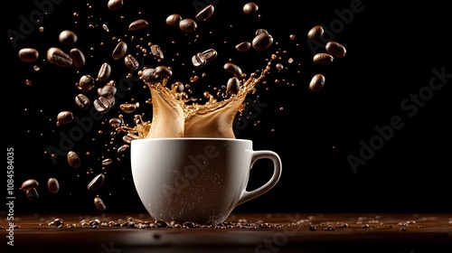 Coffee beans splashing out of a cup of coffee in mid-air, creating a dynamic and energetic visual effect