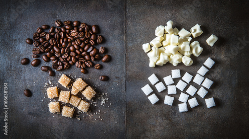 Coffee Beans, Sugar Cubes, and Popcorn Arrangement on Rustic Surface