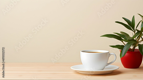 Coffee cup on wood, serene sky backdrop, minimalist, morning ritual, space for text