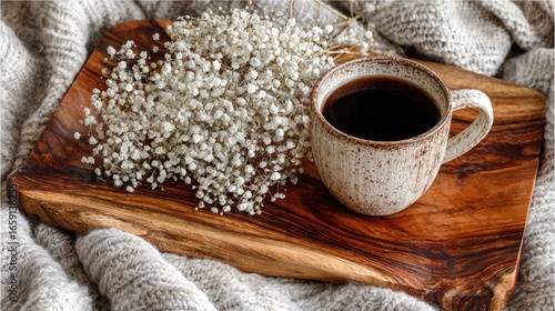 hot drink, cup, mug, tray, wooden, flower, knitwear, sweater, cosy, warm, autumn, winter, comfort, relax, home, drink, beverage, hot, dark, brown, beige, cream, white, speckled, rustic, natural, organic, texture, detail, still, life, photo, image, visual, aesthetic, peaceful, serene, calm, tranquil, simple, minimalist, beauty, elegance, style, mood