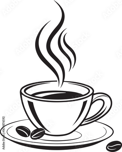Coffee Cup Vector Illustration – Hot Drink with Steam, Coffee Beans and Saucer – Black and White Line Art Design