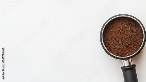 Coffee grounds in a portafilter on a neutral background, ideal for brewing enthusiasts.