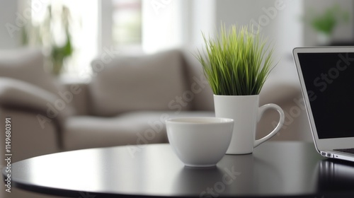 home, office, work, desk, table, hot drink, cup, mug, laptop, computer, plant, grass, living, room, interior, modern, design, cosy, comfortable, relaxing, space, lifestyle, style, background, technology, drink, white, green, black, wood, furniture, decor, aesthetic, calm, serene, bright, light, clean, minimal, simple, elegant, sophisticated, contemporary