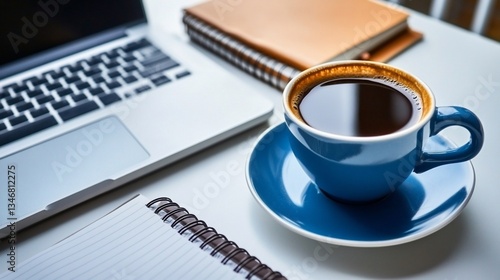 hot drink, laptop, work, productivity, business, office, notebook, lifestyle, morning, break, relaxation, calm, sharpened, concentration, blue, white, table, closeup, marketing, advertising, branding, professional, success