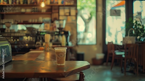 Coffee shop background. Cup of coffee latte on wood bar. Takeaway coffee. High quality AI generated image