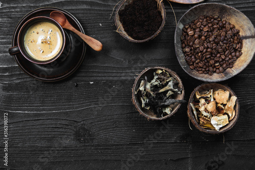 Coffee Superfood Trend, birch mushroom chaga, lion's mane mushroom, monkey head mushroom, Cordyceps, dry and fresh mushrooms and coffee beans on dark background