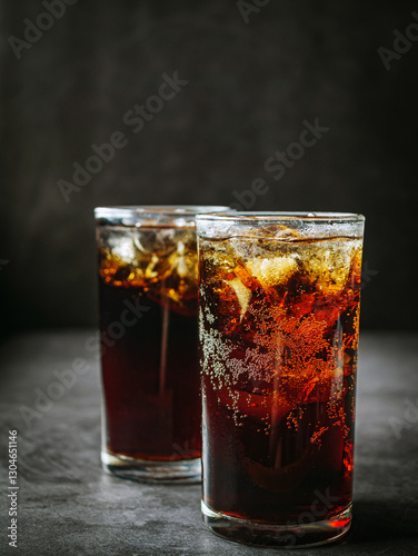 Cola soft drink with ice cubes, soda fizzy drink in Cold two glass on gray background