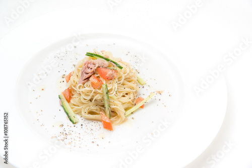 cold, pasta, pesto, background, bright, closeup, cooking, cucumber, cookery, dish, fish, food, fresh, health, healthy, image, indoor, italian, light, lunch, noodle, raw, sauce, simple, soft, spaghetti, summer, table, tomatoes, tuna, up, vegetable, white