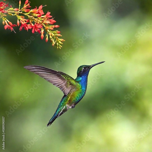 colibri flying near a flower, masterpiece, dynamic pose, side view, forest background, natural light, hr, photorealistic, wildlife photography, hyper realistic, hyper detailed, extremely accurate, 32k