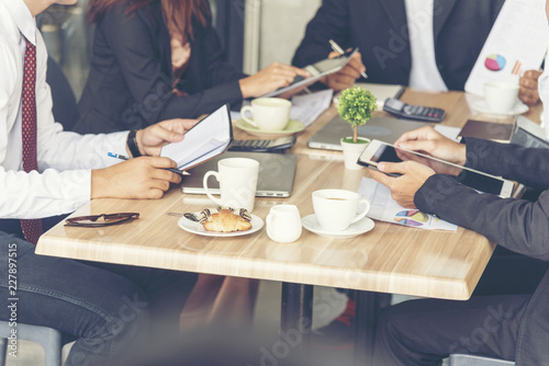 Collaboration Marketing Team Collaborate in office meeting. Group of people using smartphone working Sales Team. Marketing communications strategy in business office. Banner with copy space.