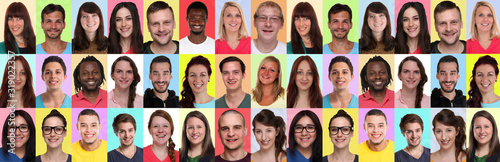 Collage group portraits of multiracial multicultural young smiling people panorama background faces
