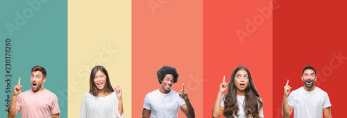Collage of different ethnics young people over colorful stripes isolated background pointing finger up with successful idea. Exited and happy. Number one.
