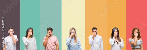 Collage of different ethnics young people over colorful stripes isolated background smelling something stinky and disgusting, intolerable smell, holding breath with fingers on nose