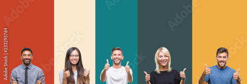 Collage of different ethnics young people over colorful stripes isolated background success sign doing positive gesture with hand, thumbs up smiling and happy. Looking at the camera