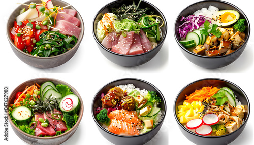 poke, food, salad, collection, dish, background, set, health, isolated, white, eatery, fish, green, vegetable, cooking, meat, tomatoes, rice, healthy, colourful, diet, collage, avocado, natural, organic, nourishment, salmon, seafood, dinner, meal, cookery, epicure, lunch, ingredient, seed, sesame, product, traditional, hawaiian, raw, bowl, delicious, different, eat, fresh, group, many, object, receipe