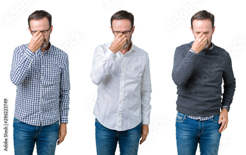 Collage of handsome senior business man over white isolated background tired rubbing nose and eyes feeling fatigue and headache. Stress and frustration concept.