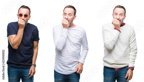 Collage of handsome senior hoary man standing over isolated background looking stressed and nervous with hands on mouth biting nails. Anxiety problem.