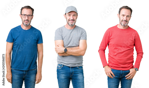 Collage of handsome senior man over white isolated background Relaxed with serious expression on face. Simple and natural looking at the camera.