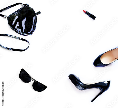 fashion, shoe, accessory, background, pair, sunglasses, lipstick, bag, object, female, black, concept, woman, white, summer, collage, collection, travel, photo, holiday, leather, tour tourism, glossy, pattern, isolated, view, closeup