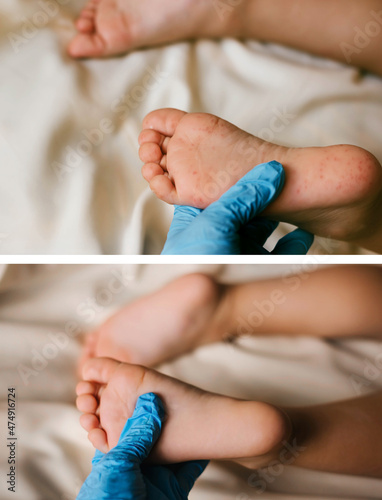 Collage rash of enterovirus infection picornavirus families on the feet of a 3-year-old child. Medicine, health concept.