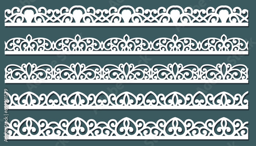 Collection seamless borders for design. Black lace silhouette isolated on white background. Suitable for laser cutting. Vector illustration.