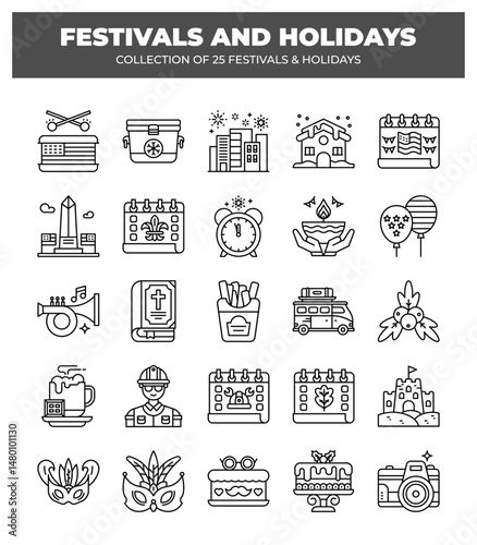 Collection of 25 Festivals and Holidays. Line Icons