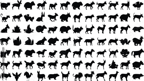 animal, domestic, pet, farm, farm animal, icon, set, collection, vector, illustration, graphic, design, element, symbol, clip art, creature, mammal, bird, poultry, dog, cat, horse, cow, pig, sheep, goat, chicken, duck, rabbit, guinea pig, hamster, animal husbandry, agriculture, wildlife, nature, organic, cute, friendly, simple, flat, outline, modern