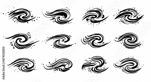 Collection of abstract dynamic swirling brush stroke effects representing motion and energy in artistic graphic design elements