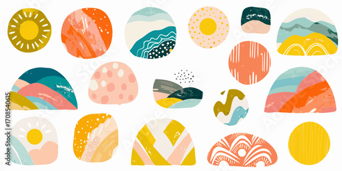 abstract, pattern, minimalist, modern, geometric, warm colors, illustration, design element, background, texture, hand-drawn, bohemian, retro, vintage, art, graphic design, collage, composition, vector, creative, decorative, artistic, stylised, colourful, vibrant, playful, whimsical, sun, mountain, landscape, wave, dot, stripes, circle, arch, cut-out, contemporary, abstract art