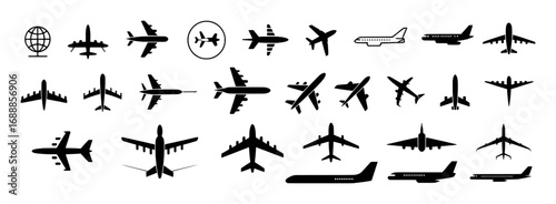 aeroplane, aircraft, jet, plane, aviation, travel, transport, flight, sky, air, globe, earth, symbol, icon, silhouette, vector, illustration, design, modern, commercial, passenger, cargo, propeller, wing, engine, fuselage, tail, landing gear, take-off, aerodrome, airline, journey, expedition, voyage, transportation, shape, set, graphic, collection