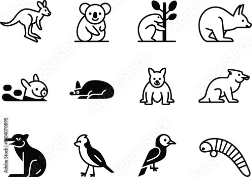 Collection of australian animal icons and illustrations in black and white