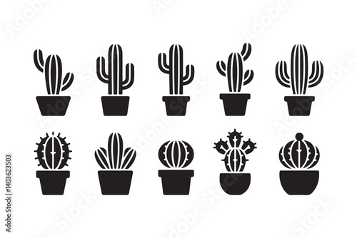 Collection of Black and White Cactus Icons in Pots