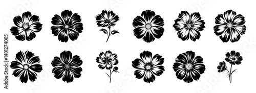 cosmos, flower, floral, black, white, illustration, design, botanical, element, silhouette, vector, graphic, isolated, clip art, drawing, artwork, nature, plant, bloom, blossom, flower petals, stem, leaf, single, multiple, set, collection, decoration, aesthetic, elegant, vintage, stylish, beauty, art, pattern, symbol, image, monochrome, dark, light, contrast, texture, shape, line, detail, simple, graphic, artistic, ink