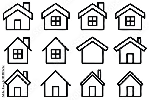 house, home, real estate, property, residential, architecture, building, outline, vector, icon, set, collection, illustration, black-and-white, monochrome, line art, simple, minimal, bungalow, roof, window, door, chimney, structure, design element, graphic, drawing, concept, housing, isolated, template, symbol, signs, image, asset, clip art, estate, construction, dwelling