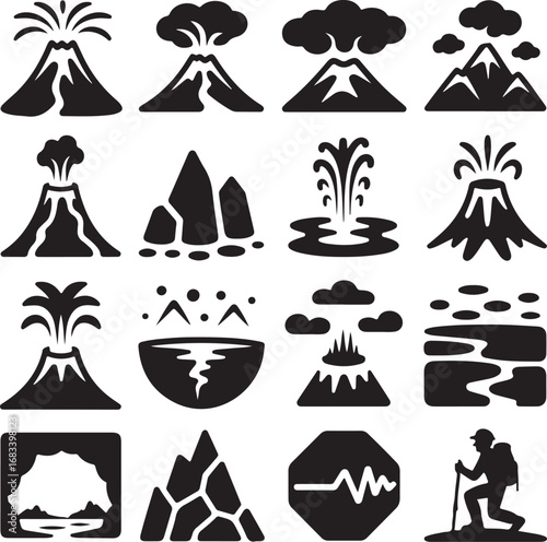 Collection of black and white volcano and geological icons Keywords: volcano, eruption, lava