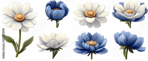 flower, floral, blue, white, daisy, anemone, botanical, bloom, blossom, flower petals, plant, nature, illustration, design, graphic, artwork, art, image, digital, pixel, flower, spring, summer, cute, pretty, aesthetic, soft, pastel, delicate, simple, elegant