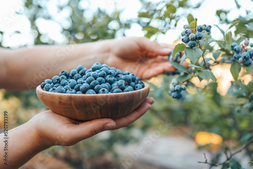 Collection of blueberries, female hands hold a wooden plate with a berry on the background of a bush, a place for your text