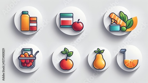 Collection of colorful food icons including fruits, vegetables, and packaged goods on white circles