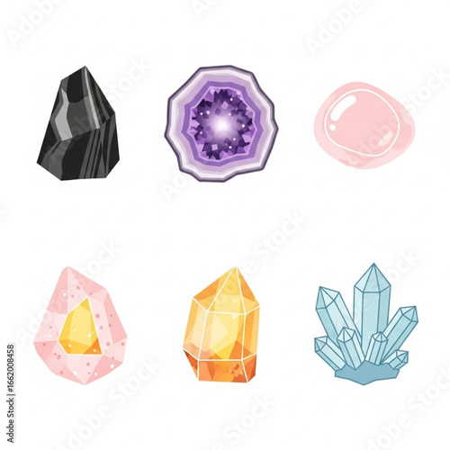 gemstone, crystal, mineral, geology, stone, rock, agate, quartz, amethyst, citrine, rose, black, purple, pink, yellow, blue, shiny, faceted, rough, polished, geode, flocked, specimen, collection, precious, gem, cut, natural, formation, geologic, texture, pattern, luster, opaque, semitransparent, transparent, violet, orange, water, illustration, drawing, artwork, design, element, graphic, isolated, decorative, symbol, icon