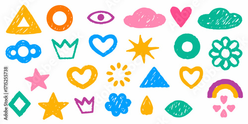 Collection of colorful hand drawn doodle shapes and icons on a white background