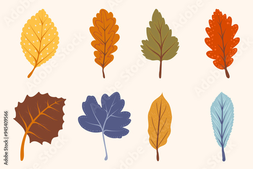 Collection of colorful leaves isolated on white background. Beautiful doodle hand drawn leaves.