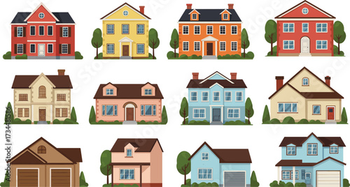 Collection of colorful suburban house illustrations with diverse architectural styles, residential designs, landscaping, and modern home concepts for real estate projects