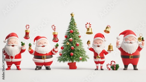Collection of cute 3D Santa characters decorating a tree, ringing bells, and carrying candy canes, isolated on white