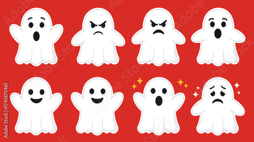 Collection of cute cartoon ghosts with various facial expressions on red background.
