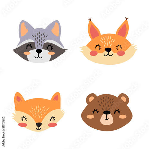 Collection of Cute Funny Animal Faces and Heads. Raccoon, squirrel, fox, raccoon. Set of different cartoon faces isolated on white background. Colorful hand drawn vector illustration.