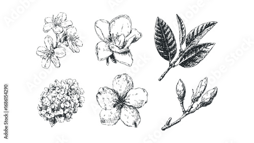 flower, botanical, nature, vignetting, plant, flora, leaf, bloom, organic, garden, tree branch, floral, drawing, blossom, detail, texture, foliage, natural, botany, vintage, outline, spring, ink, growth