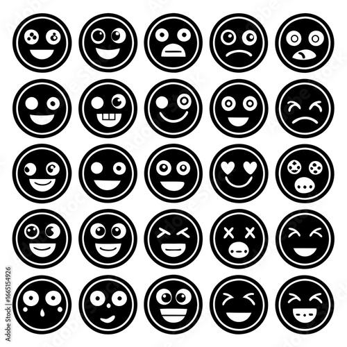 emoticon, face, emotion, expression, smiley, happy, sad, laughing, crying, surprised, angry, love, wink, cool, icon, symbol, graphic, design, illustration, vector, set, collection, white background, silhouette, black-and-white, simple, modern, communication, feeling