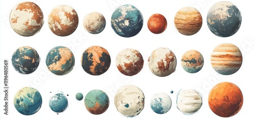 Collection of diverse planets, moons, and celestial bodies, digitally illustrated.