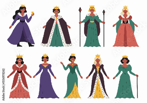 Collection of Diverse Queens and Princesses in Regal Medieval Dresses Illustration Set
