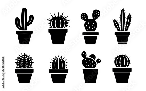 Collection of Eight Black Cactus Silhouettes in Pots Keywords: cactus, succulent, plant, potted